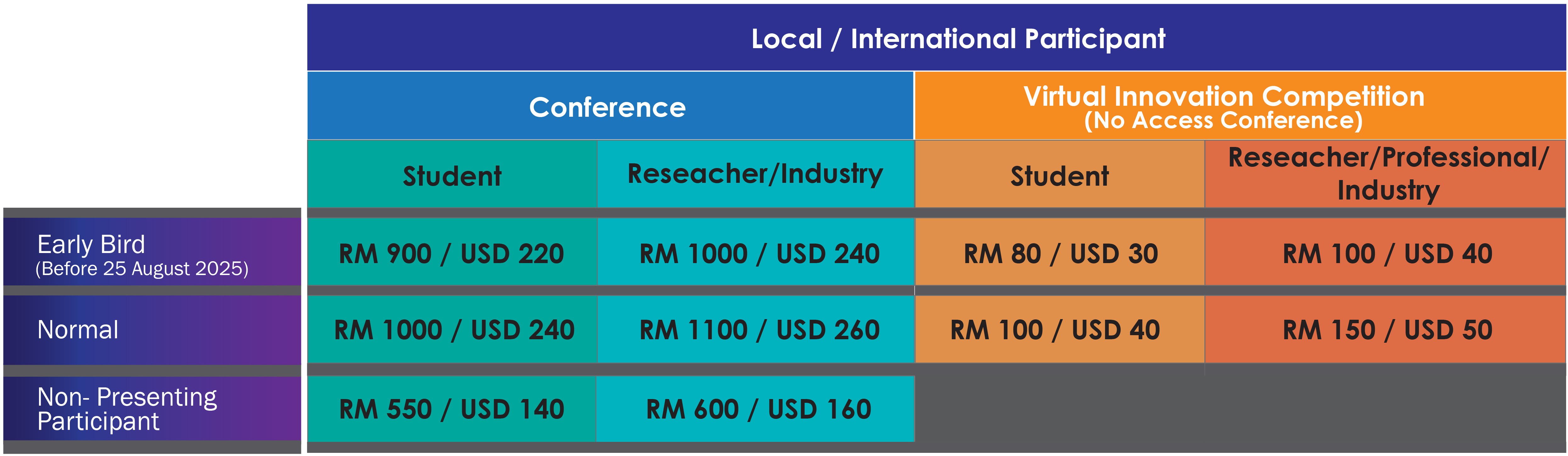 - All fees must be paid in Ringgit Malaysia or US Dollar. Any bank charges will be borne by the participant.